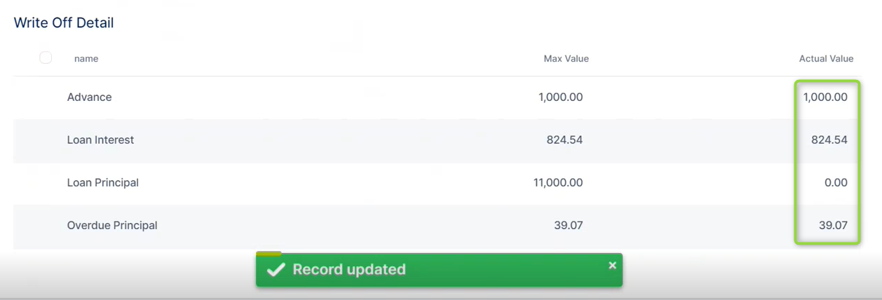 For example, you can specify to perform a write-off transaction for the maximum values for the advance, the loan interest, and the overdue principal, leaving the loan principal unchanged: