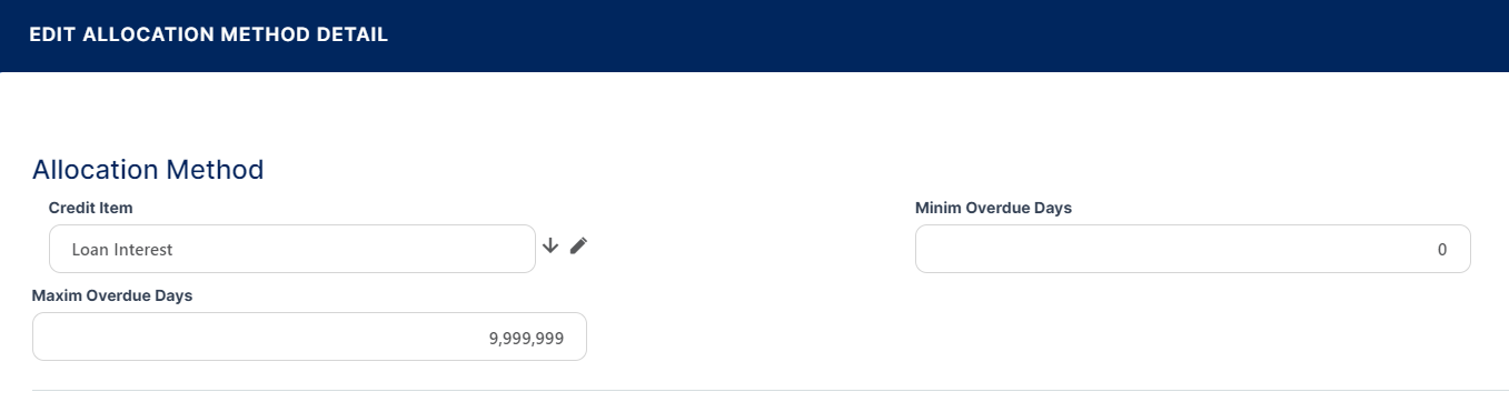 The maximum and minimum number of overdue days is relevant when creating allocation methods as an account can have one or more loan principals. If, for example, there are two loan principals, the allocation method is applied based on the oldest one. Thus, depending on the date, the installment is allocated to the oldest loan principal and then moved to the other credit items.IMPORTANT!