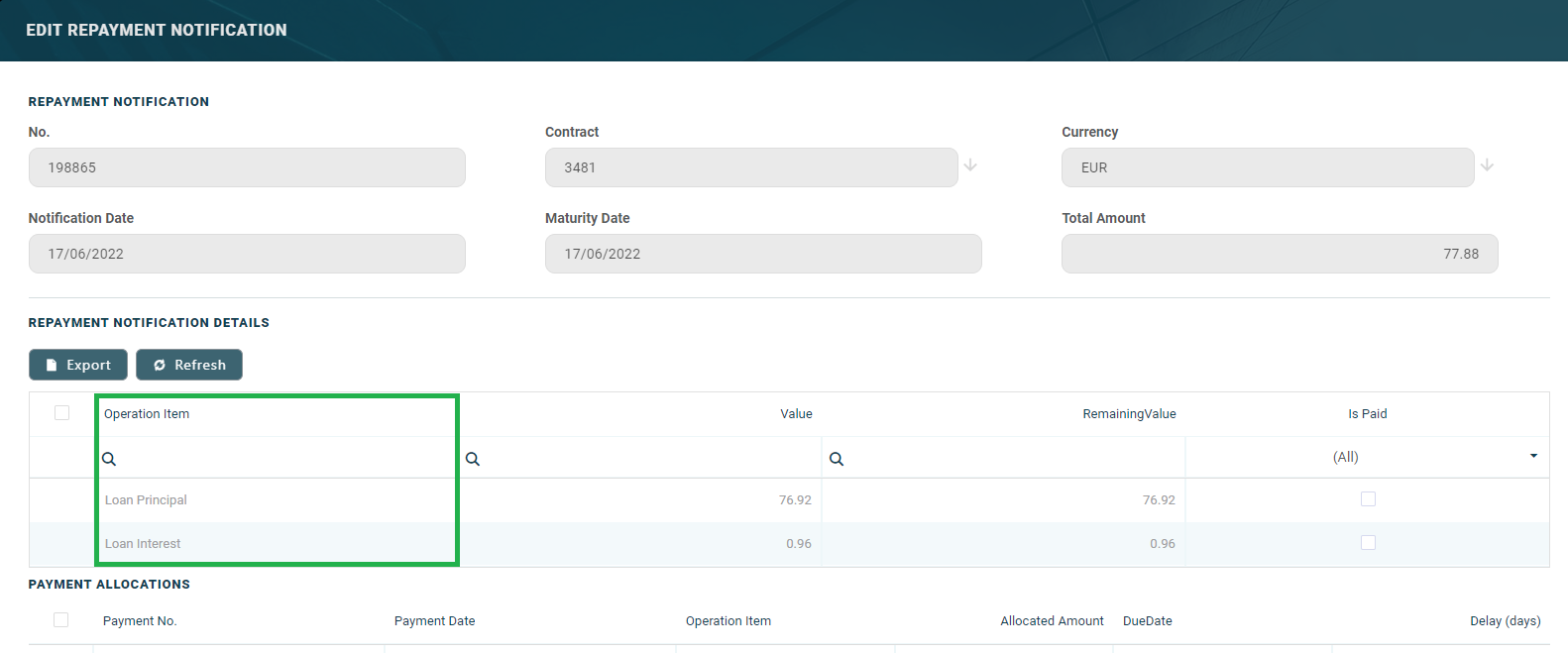 If a repayment notification is not linked to a contract, then Loan Management takes the operation item value from the allocation method configured within the