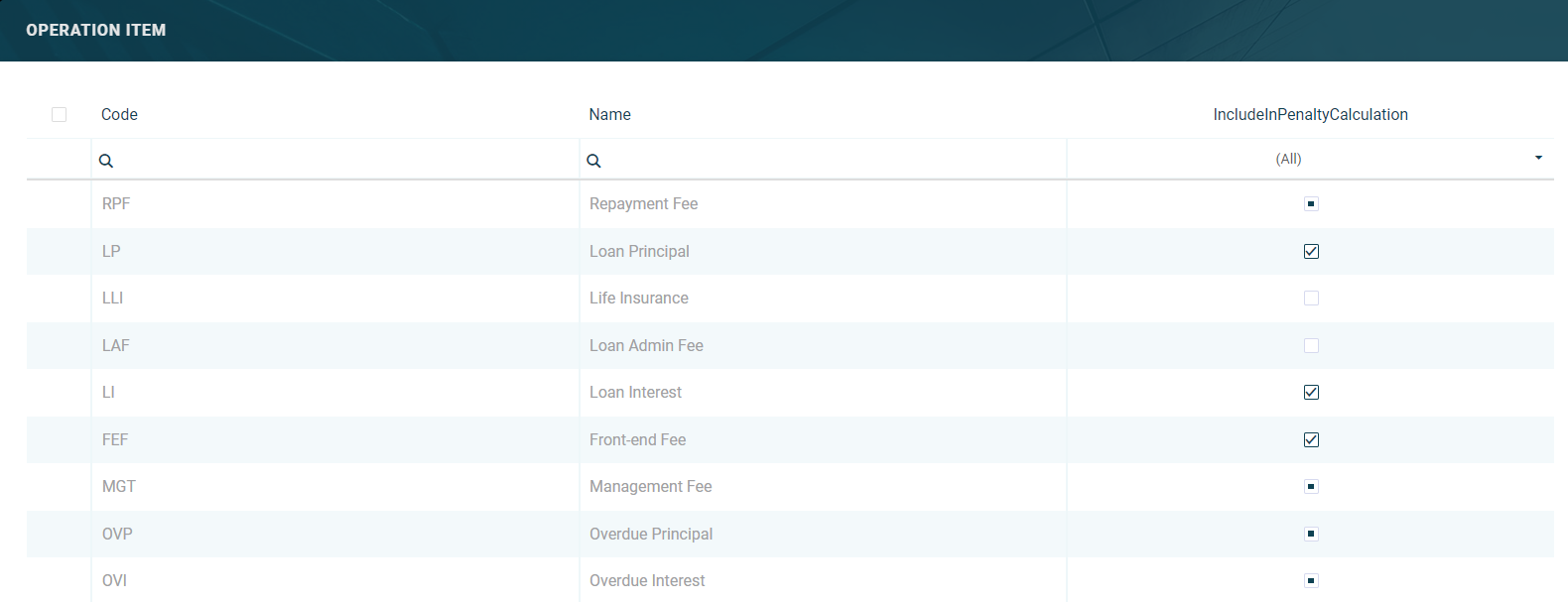 Operation items are those items that relate to a bank's core business, such as all types of fees, commissions, principals, interests, advances or penalty calculations. You can also consider them as balance types that add up to a certain deal or used in tracing what happened on a particular deal. For instance, on the first day of using a new loan, there is only the Loan Principal (LP) on that deal, or it can also have an Advance (ADV) in some particular cases or even a Frond-End Fee (FEF). As the deal progresses, depending on the definition and costs, as well as on repayments, the loan principal can become Paid Principal (PP) or Overdue Principal (OVP) if due amounts are not paid.