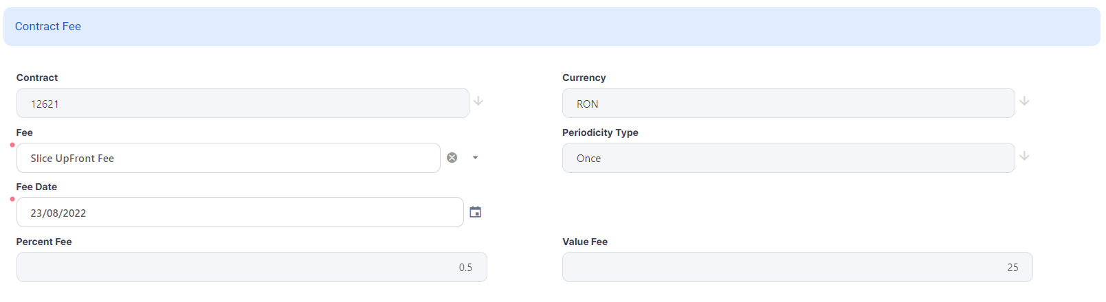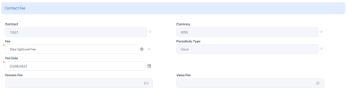 Optionally, check the rest of the fields, automatically filled in by Loan Management: contract number, currency, periodicity type of the selected fee, the fee percentage or value applicable for the selected date. You can't change these values.