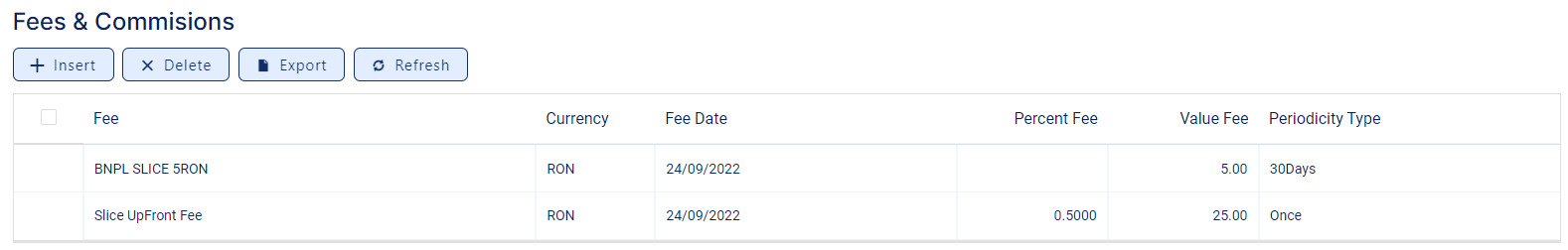 In the Fees & Commissions section within the Overview tab of the contract, you can view all the fees and commissions configured at the product level that have the Automatic Load on Contract checkbox set to True. After the first saving operation, Loan Management display all the fees that are defined as values. The fees defined as percentages are displayed after completing all the values of the contract. Read more about the commissions automatically inserted and calculated in the below section. You can also add, delete or export fees and commissions for the contract.