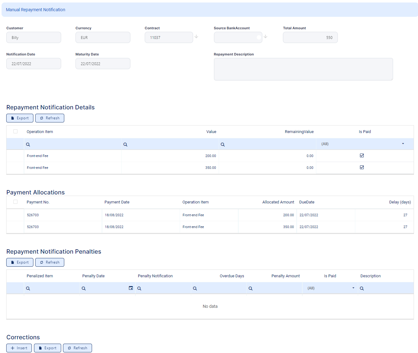 The Repayment Notification shows what was made due, when, how much, what type of amount and when/if amounts were recovered.