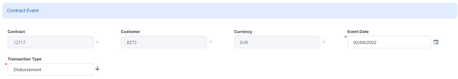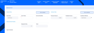 The event is saved in Draft status and a transaction number is automatically generated for it. The Edit Contract Event page corresponding to the selected transaction type is displayed. A series of value fields are automatically calculated, their values are displayed, and you can't edit them: the contract's financed and available amounts, the selected installment calculation method, the repayment day ant the contract's tenor. -