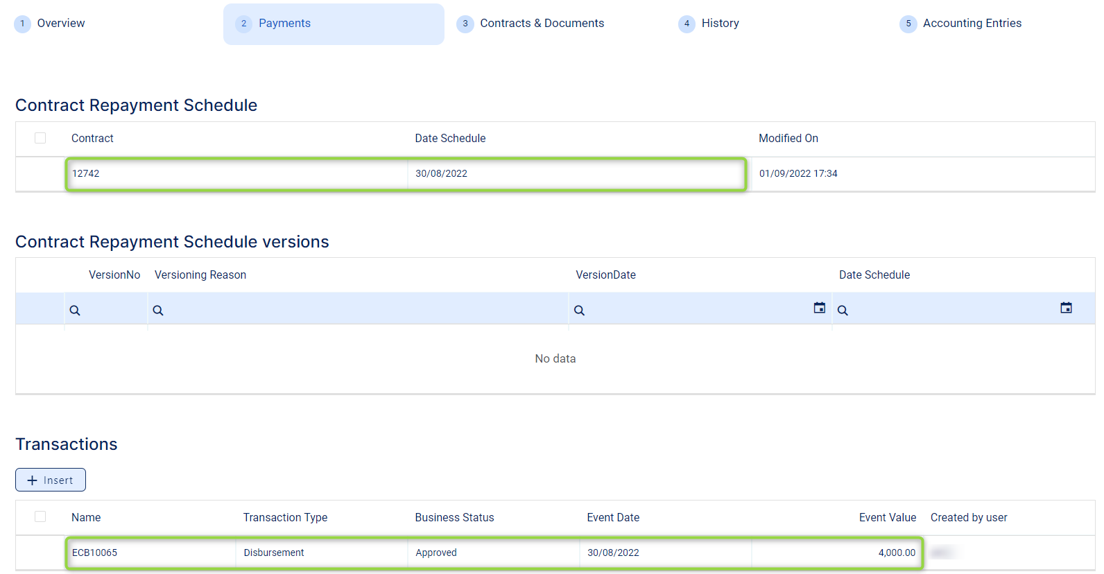 The event value is now applied and visible in the contract's Payments tab -> Transactions section.