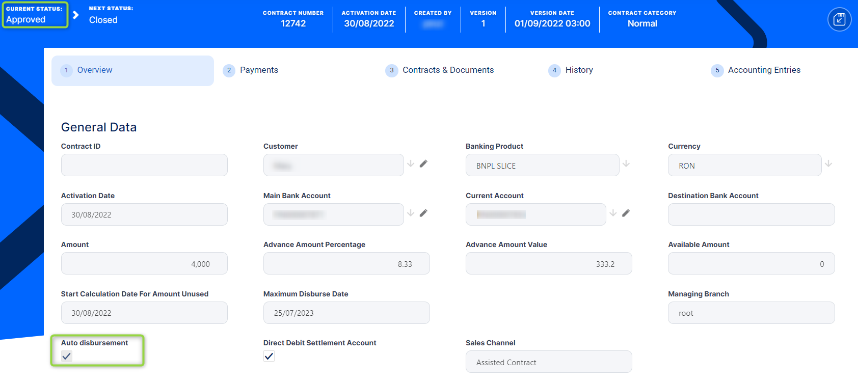 You can instruct Loan Managementto automatically perform the disbursement of funds for a loan contract during contract creation, if the auto disbursement property was set at banking product level. To do this, select the Auto disbursement checkbox in the contract's Overview tab, thus marking the financed amount to be automatically disbursed on the approval of the contract.