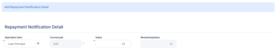 On the Edit Manual Repayment Notifications page, click Insert to open the Add Manual Repayment Notification Detail page. The page already has the currency of the notification and the remaining value still to be paid from the notification value completed. When you create the notification detail,