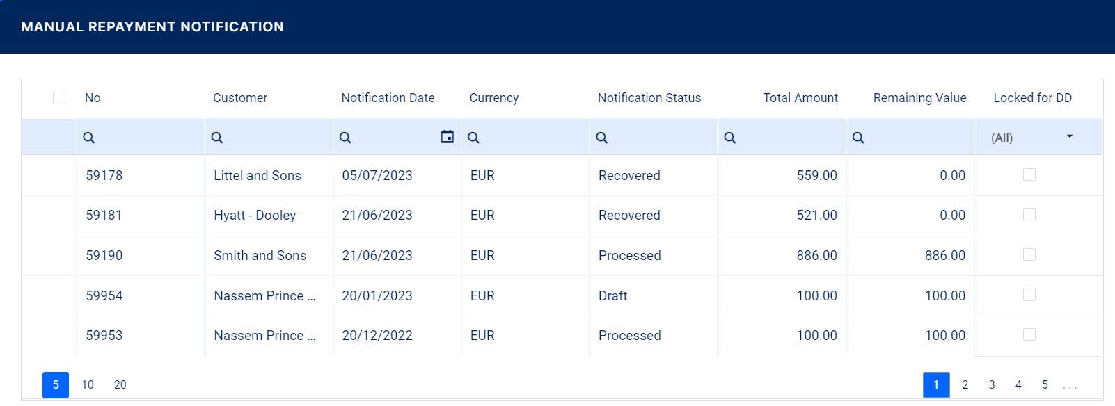 Click Manual Repayment Notification menu item to open the Manual Repayment Notifications page.