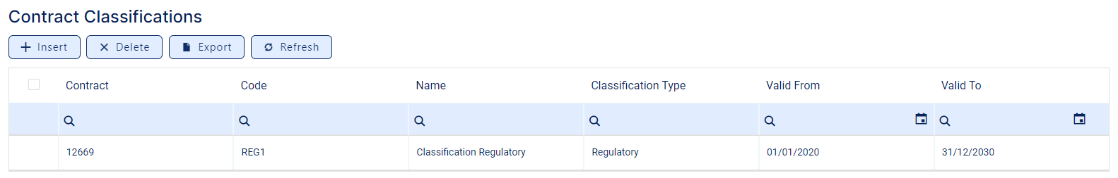You can manage a contract's classification within the Contract Classifications section on the Overview tab. Here you can insert, delete or export classifications for the contract.