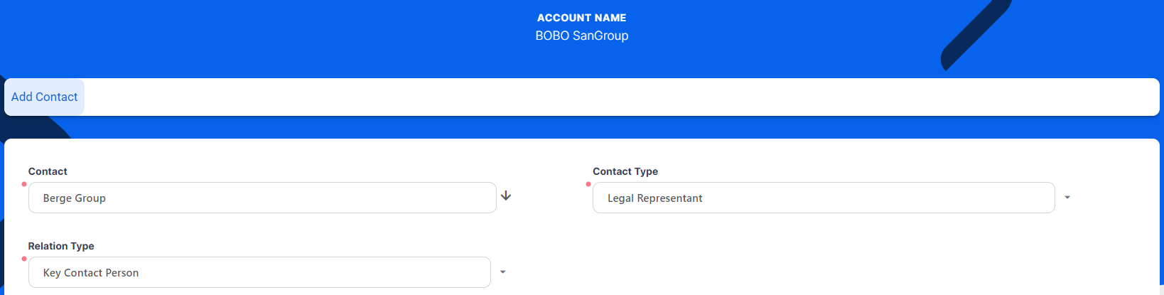 Contact - Select an existing customer from the database as your new customer's representative.