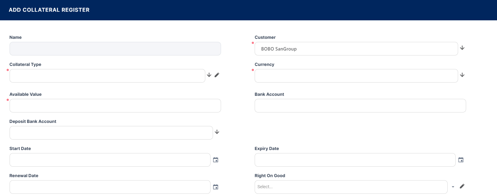 To add a new collateral register record to the customer, follow these steps:
