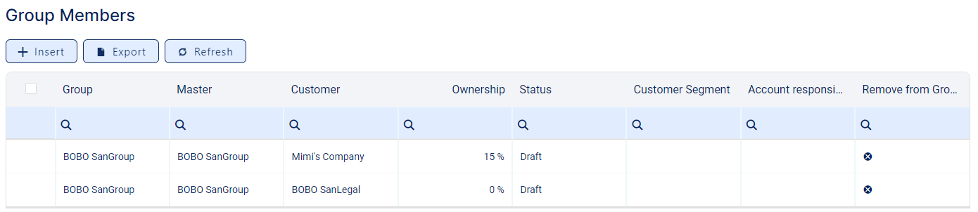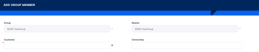 Click the Insert button within the Members/Group Members section to display the Add Member/ Add Group Member page, with the master and the group automatically completed with the current customer's values.