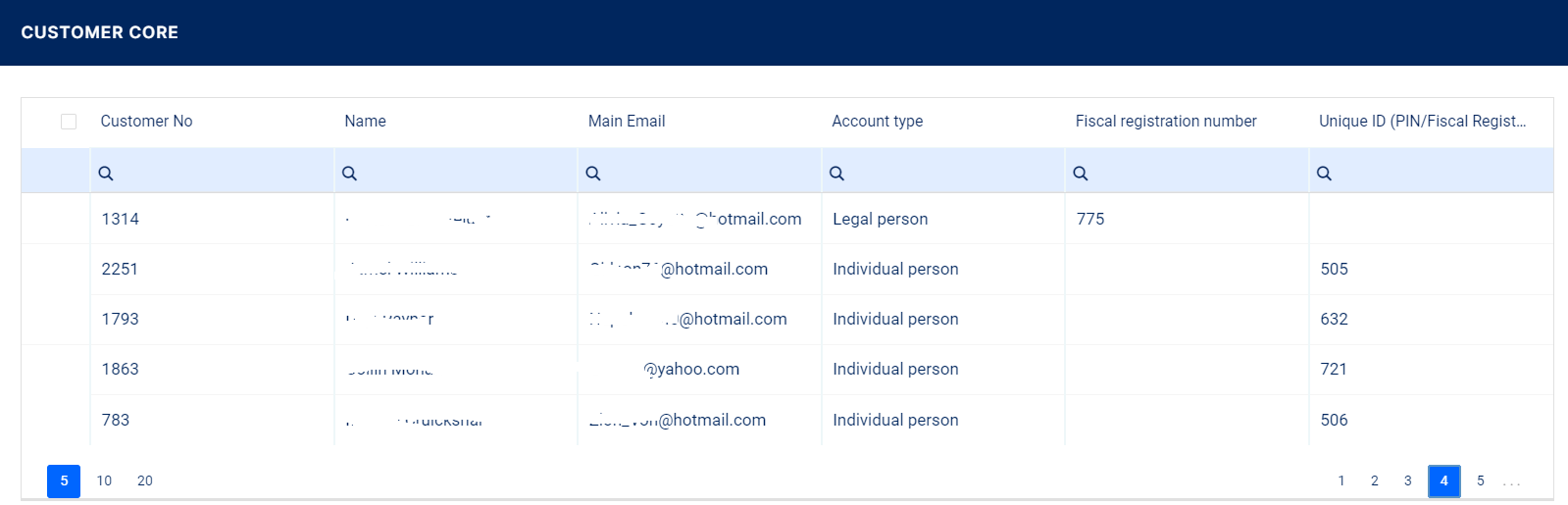 On the Customer Core page, you can add new customer records or search, edit, and delete existing ones.