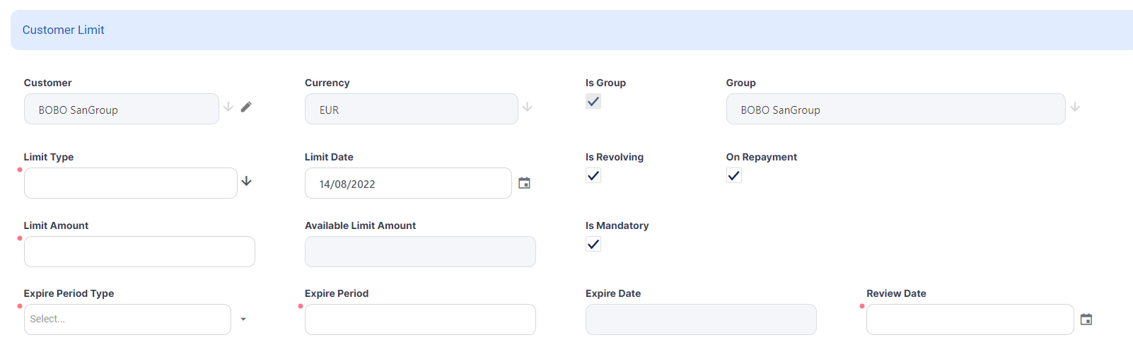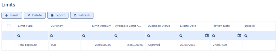 Set the customer's limits in the Limits section. If the customer is a group, then all the limits applicable for the group, coming from group members, are listed here.