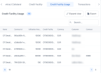 The pane displays the list of credit facility usage records, with information about each record's name, contract id and number, utilization amount, credit facility number, currency, and customer.