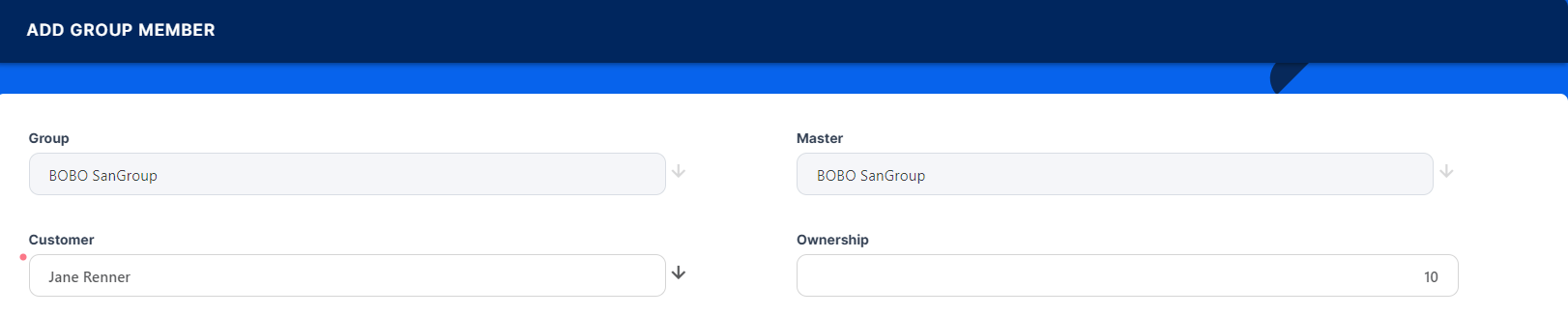 Add new members to the group by clicking the Insert button from the Group Members section. If a member has other members associated with it, they are all displayed in the same section. For a more clear picture of the group, you can insert an ownership percent, determined by dividing the number of shares they own by the number of outstanding shares.
