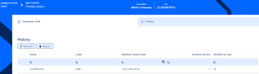- Click the Save and Reload button. Loan Management saves the limit and generates a number for a record, then displays it at the top of the page along with the name of the customer. The History tab is also displayed, containing information about each version of the record.