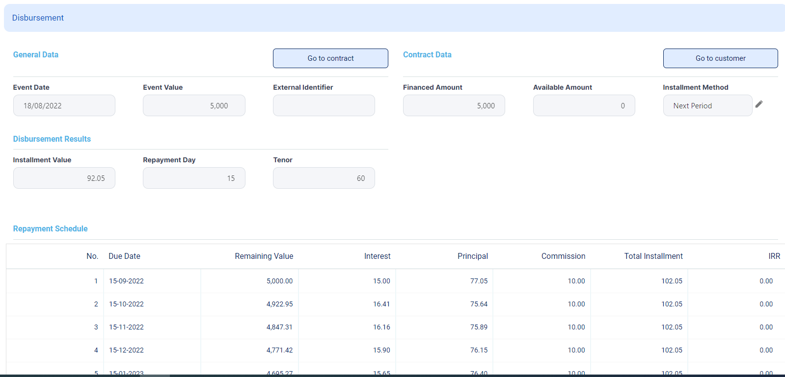 On the Payments tab you can see the repayment schedule that was generated following the disbursement (the auto disbursement functionality was selected), the disbursement transaction itself, the notification that was created for the flat upfront fee. Not only it got created but it is also settled from funds on the Current Account selected for settlement purposes, the same where funds were disbursed.
