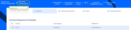 Version Draftstatus, changing its status toApprovedand then confirming your action. Thus, Loan Management applies the new recalculated repayment schedule to the contract. -