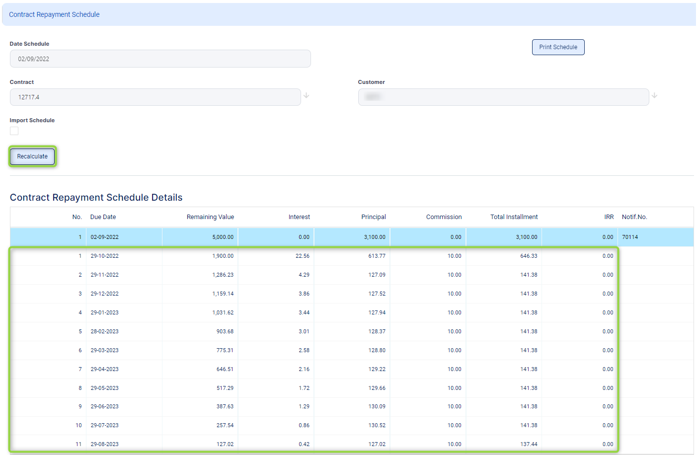 Remember to recalculate the repayment schedule before approving a contract in