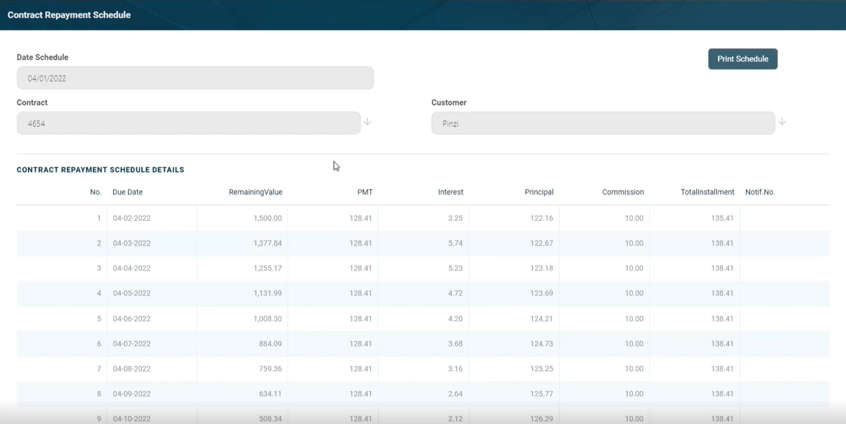 .pdffile, click the Print Schedule button. Your browser automatically downloads thePaymentScheduleFilefile, with all the information displayed within the Contract Repayment Schedule page.