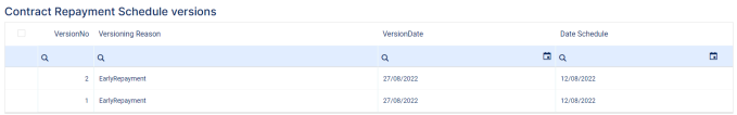 In the contract's Payments tab, go to the Contract Repayment Schedule Versions section. The section displays only basic information about the generated versions, such as version number, versioning reason, version creation date and the date of the previously active schedule.