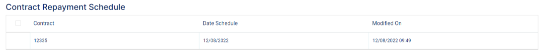 In the contract's Payments tab, go to the Contract Repayment Schedule section. This section displays only basic information about the generated schedule, such as contract number, schedule date and last modification date and time.