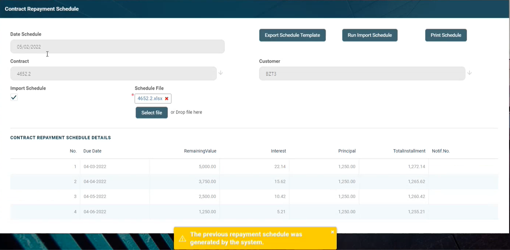 On the newly opened Contract Repayment Schedule page, select the Import Schedule checkbox. The Schedule File field is displayed, with the Select file button. The Export Schedule Template button is also displayed. A warning message informs you that "The previous repayment schedule was generated by the system".