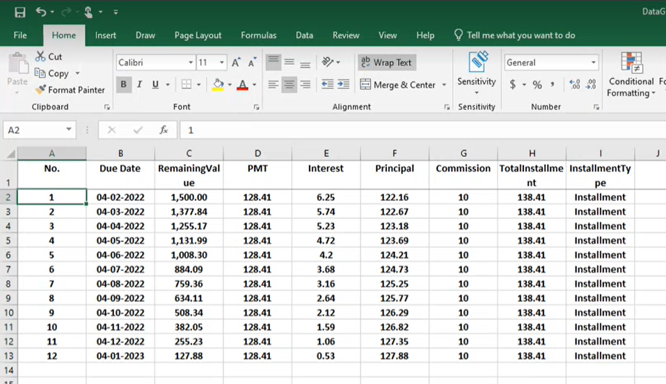Make sure you don't change the data formats within the columns, except for the Due Date column which needs to beText. Do not change the headings. Validations are performed for the file after uploading it to Loan Management, when the record is saved, and incorrect formats or data are not accepted, then error messages are shown for such files.IMPORTANT!