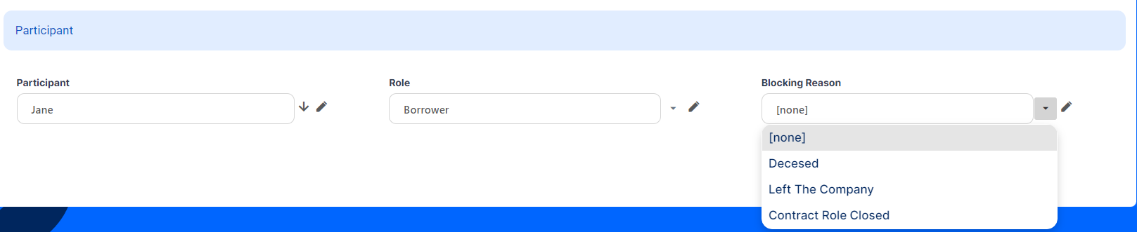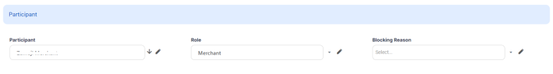 2. On the displayed Participant page, in the Blocking Reason field, choose the reason for blocking the selected participant from accessing the contract.