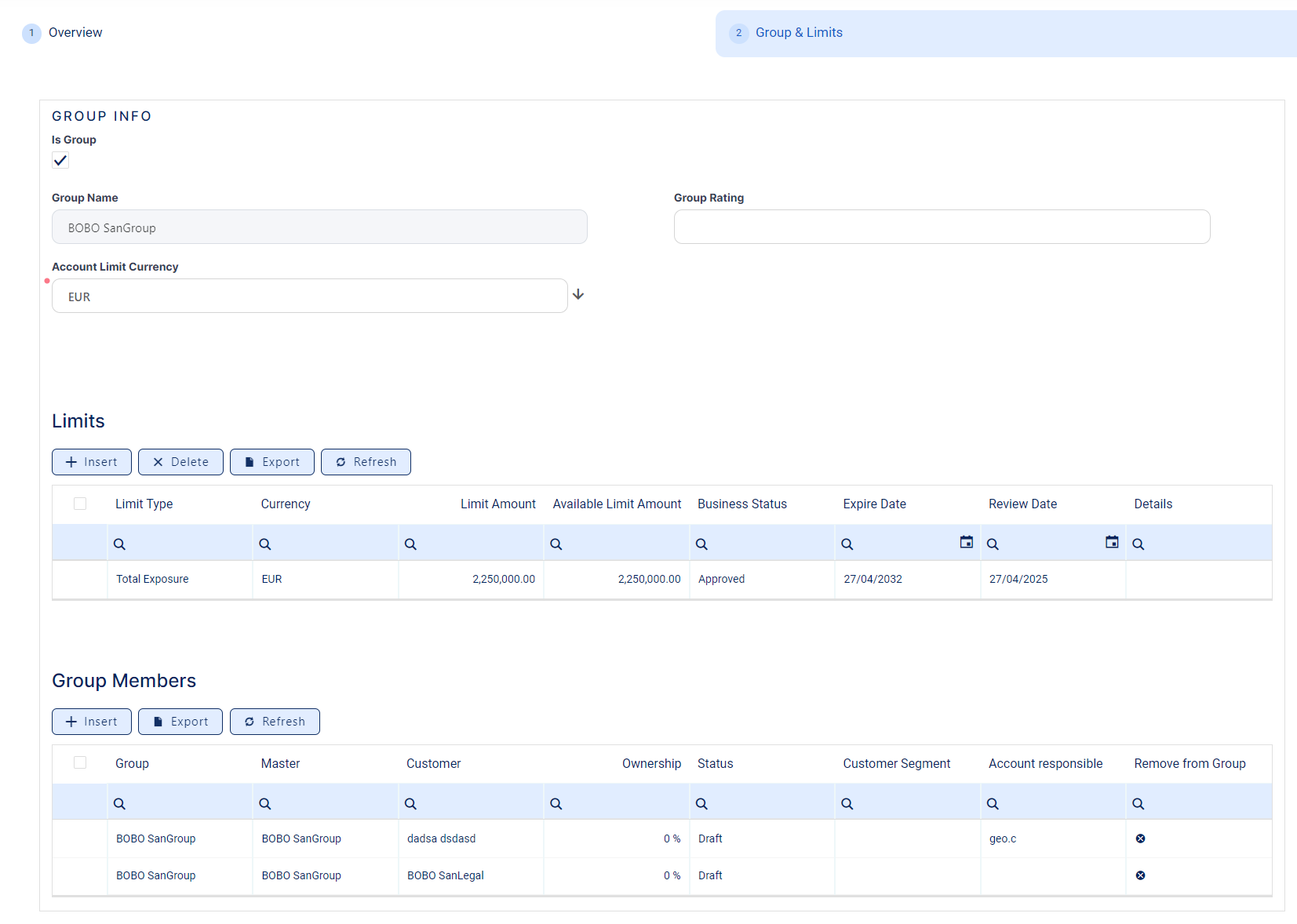 LimitMandatoryForIndividuals system parameter is set to True, Loan Management performs limit validations for a group containing individual customers the same way as for groups composed solely of legal persons.Go through the sections available within this tab to perform the following tasks:
