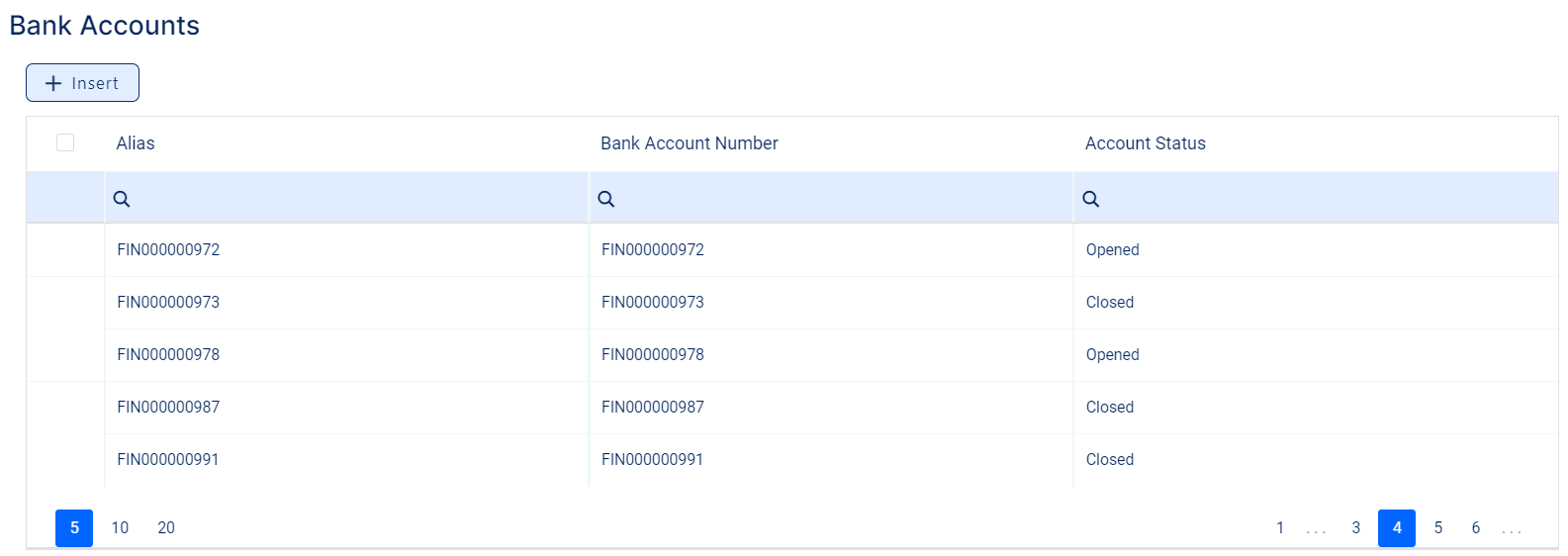 Under the Bank Account section, click the Insert button to open the Add Bank Account page.