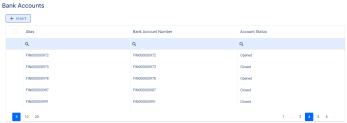 For an existent bank record, view all the accounts opened for that bank record in your system within the Bank Accounts section. If the bank is marked as Main Bank, then all the accounts created for customers when approving a new contract are listed here. Each account shows the alias, the number, and the status of the bank account.