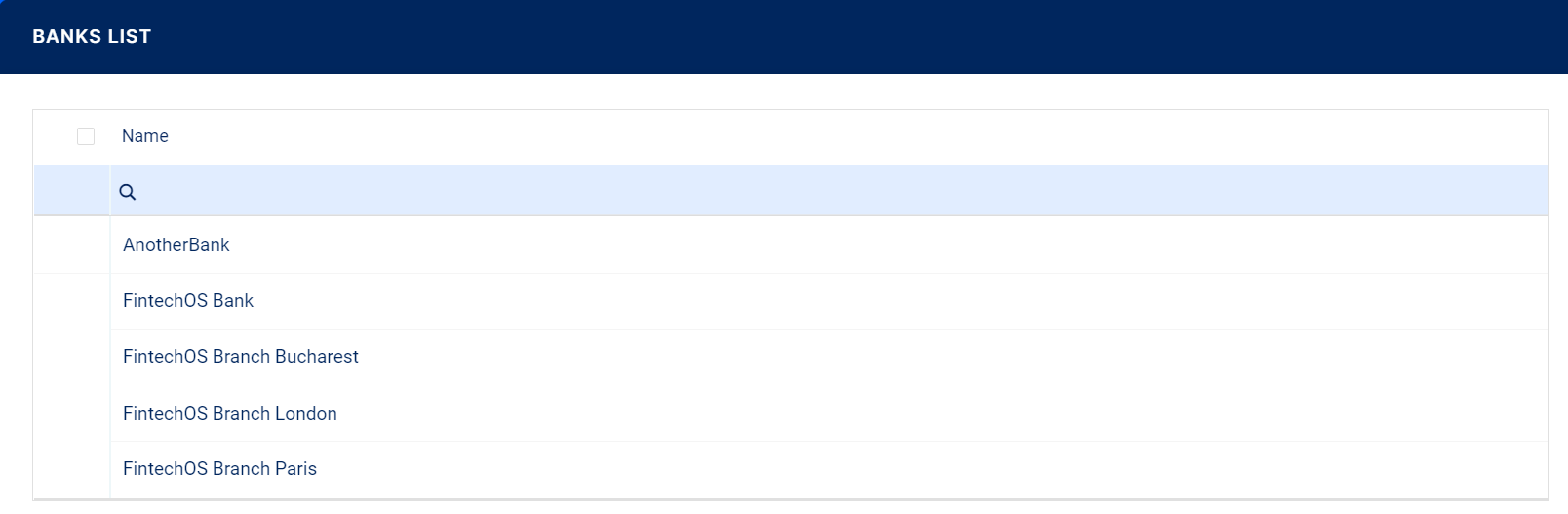 On the Banks List page, you can add new bank records or search, edit, and delete existing ones. You can also create external bank accounts for customers.