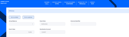 Contract transactions are events/ changes performed at the Approved contract's level. Such events are top-ups, withdrawals, and transfers between the customer's accounts. Read more information about the available transaction types in the Transaction Types Used in Loan Management topic.