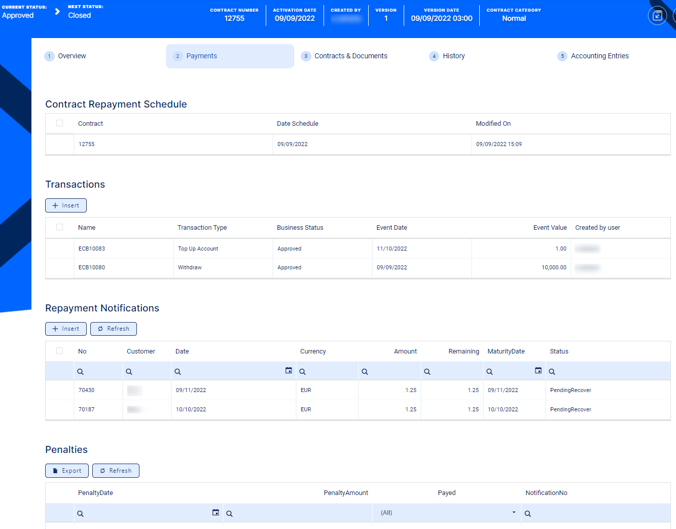 You can find all the existing transactions, payments, penalties, bank account operations, repayment schedules, schedule versions, repayment notifications for a contract on the Payments tab. The tab has no information to display for contracts in Draft status. Approve the contract to perform any transactions on the contract.