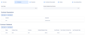 You can set collaterals as guarantees for secured loan contracts in the Collaterals tab. This tab is displayed only for contracts based on secured products.