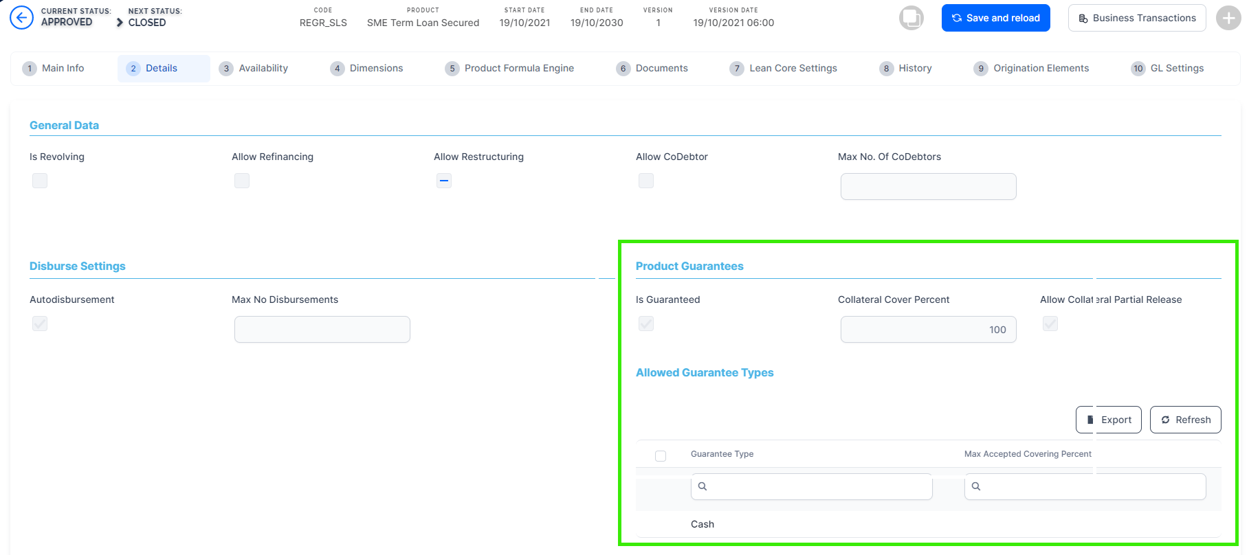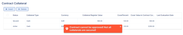 - Change the status of the collateral to Secured before approving the contract, otherwise Loan Management triggers an error.