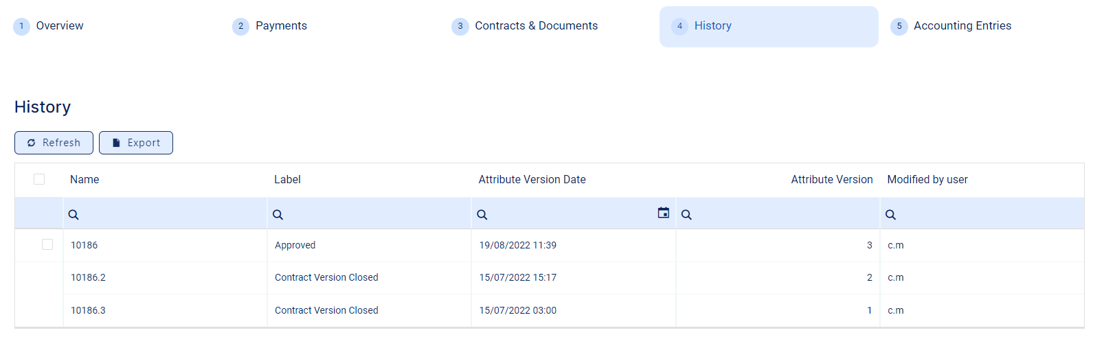 You can view the versions of the contract, along with workflow status and the user who modified the record, in the contract's History tab.