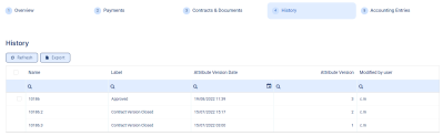 A contract can have only one Draft version, one Current version, but it may have multiple History versions, which are displayed in this section. Here you can track the contract's life cycle and view older versions that are no longer active. Double-click a version in the list to view its details.