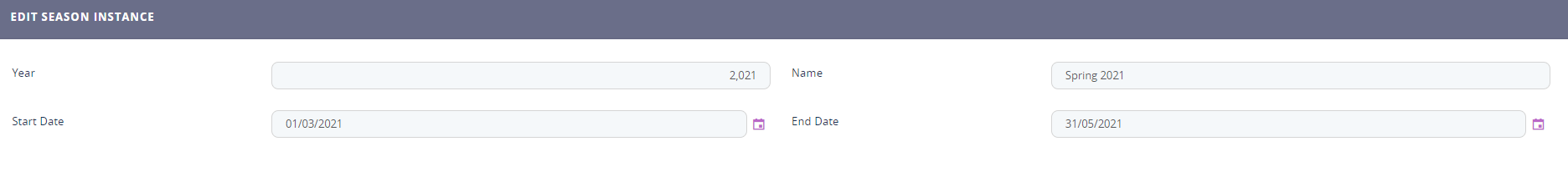 ). The Add Season Instance page appears. - Type a Year and Name . Select the season instance Start Date and End Date.