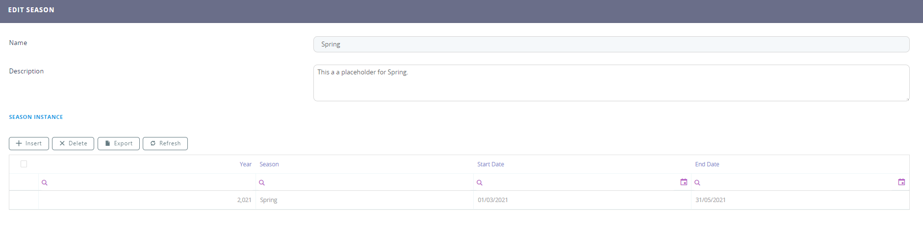 To edit a season, in the Seasons List page, double-click the record that you want to edit. The Edit Season page appears.