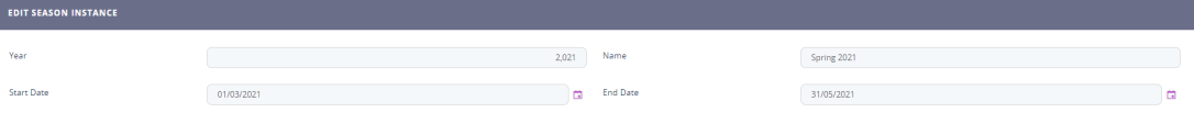 - Type a Year and Name . Select the season instance Start Date and End Date.