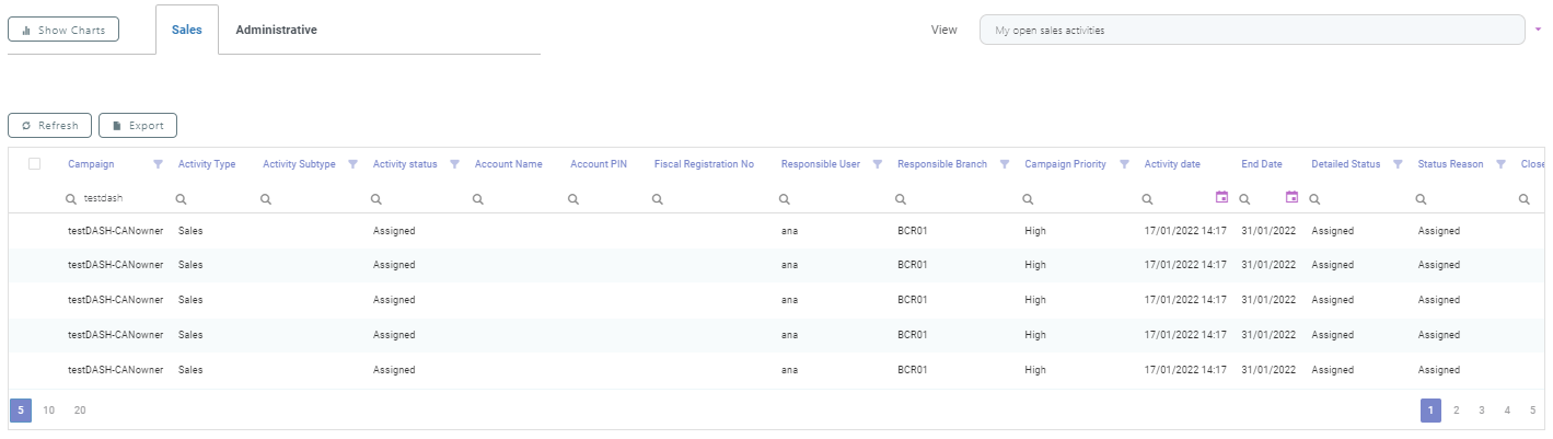 After setting the status reasons template for an internal campaign, sales or administrative campaign activities are generated. Internal campaign activities are generated after a campaign that generates internal activities is defined and approved. The person responsible for contacting the clients can access each campaign activity and based on the information presented on the activity level, the client is contacted. After the client feedback is received, the status of each campaign activity is updated. For both sales and administrative campaign types, the below data is displayed: