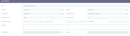 | Campaign Type | Yes | Lookup | The campaign type. It allows financial institutions to better organize between their campaigns. For example: Easter campaign, Summer campaign, or even a campaign that offers a special interest rate for a limited time period. For additional details, see the Managing Campaign Types page. |