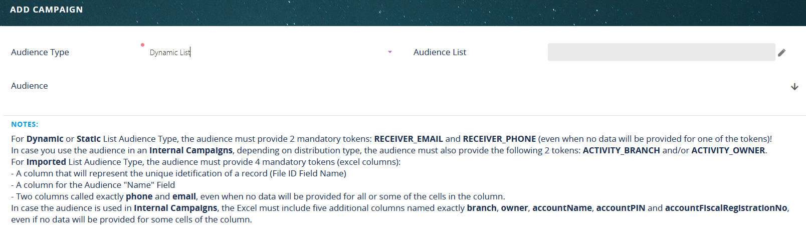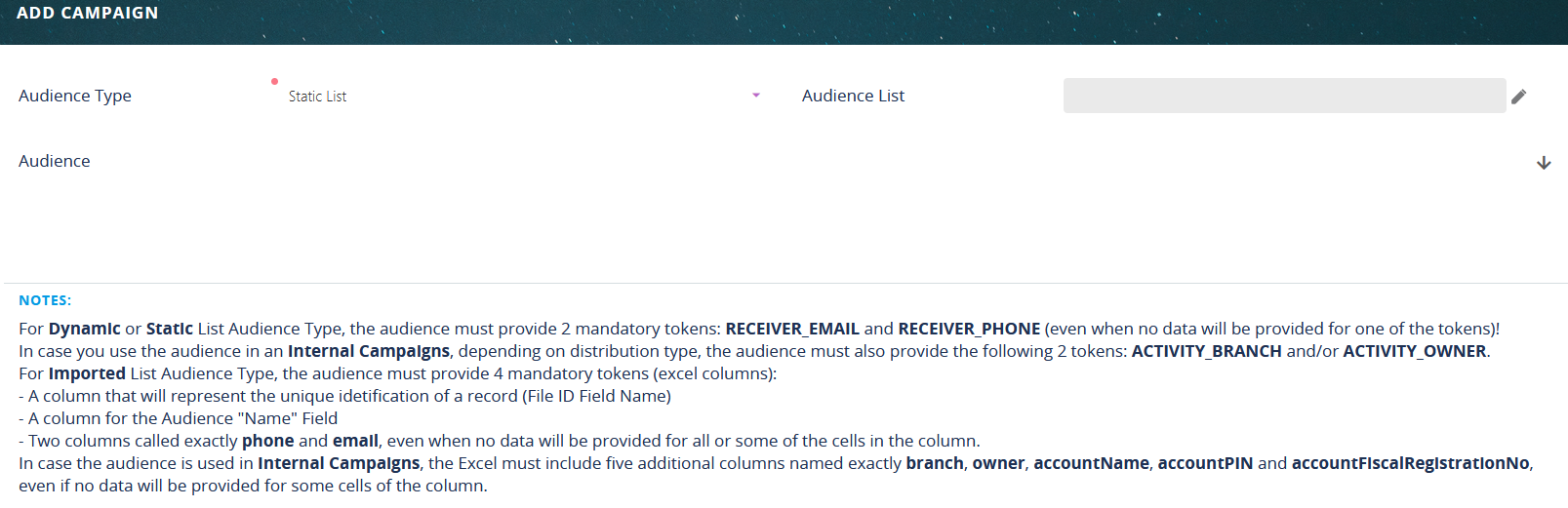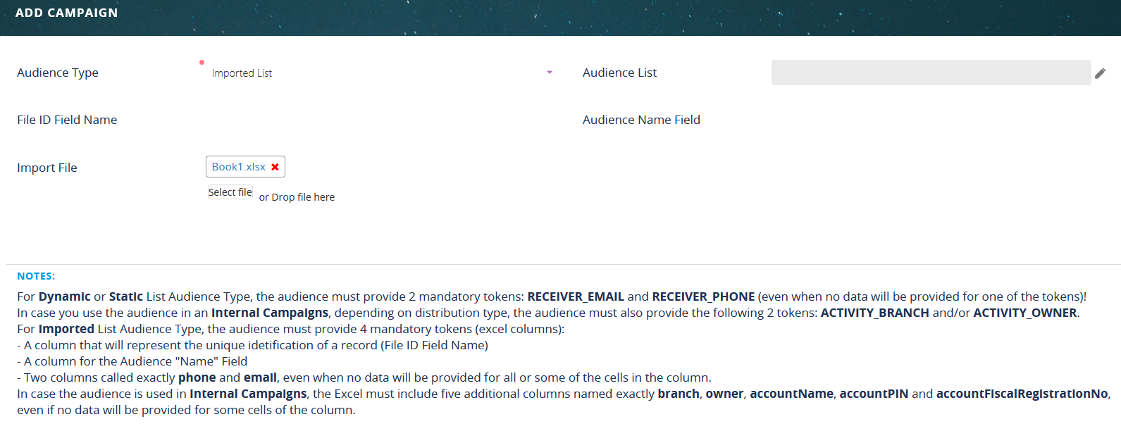 For internal campaigns, five additional Excel columns, or tokens, must be provided for the audience. These columns must be called exactly “branch”, “owner”, “accountName”, “accountPIN” and “accountFiscalRegistrationNo”, even if no data is provided for one of the columns.
