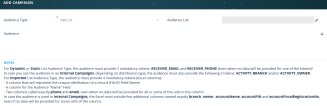 Audience is any specific person that exists in the database that agreed to a data processing consent for marketing purposes and which fulfills any conditions that might be set. To define the campaign audience, click the Audience tab. The content of the Audience section varies based on the Audience Type selected. The Audience field filters the available audience with certain rules data in order to deliver a customizable marketing experience. The data source for the audience is the audience type, which can be: