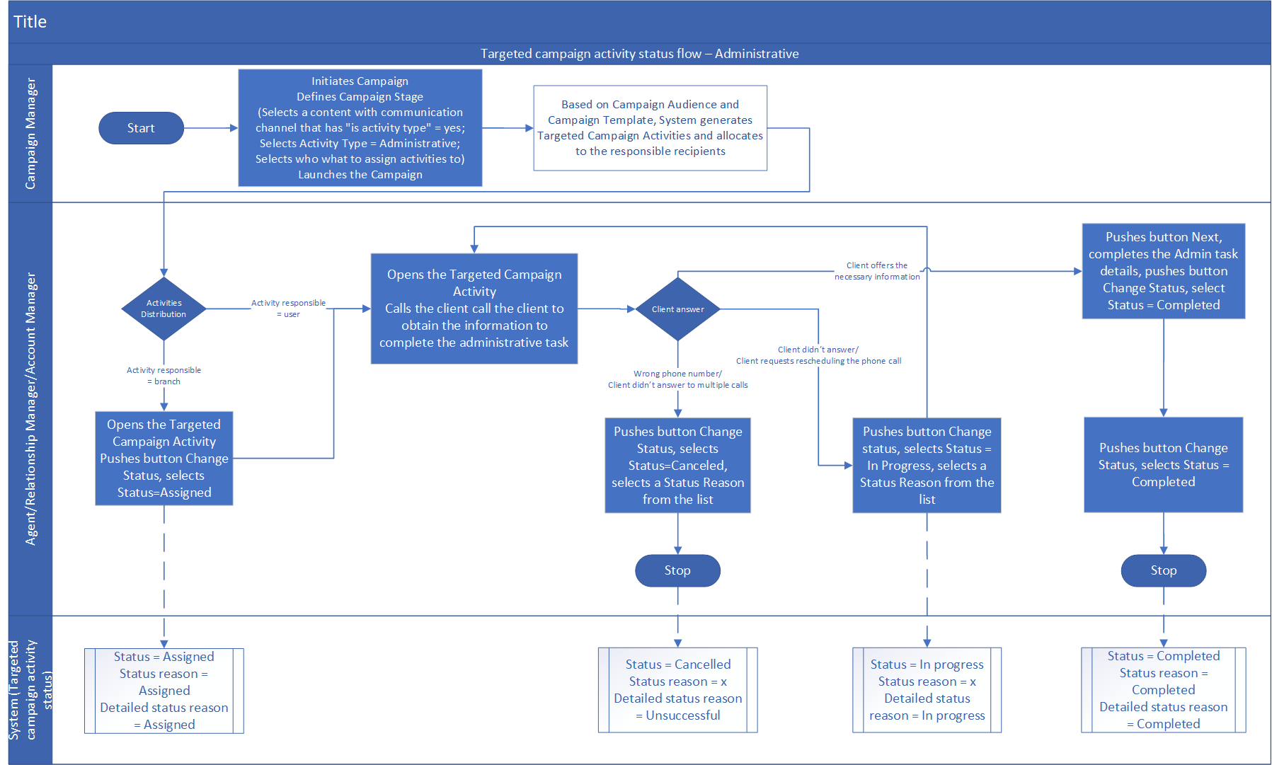 Campaigns are made through typical communication channels namely email, text messaging, online chat messaging, phone calls, mail, or even through the banking mobile application that the customer is using. Once these campaigns are started, they generate certain campaign activities that need to be handled internally.