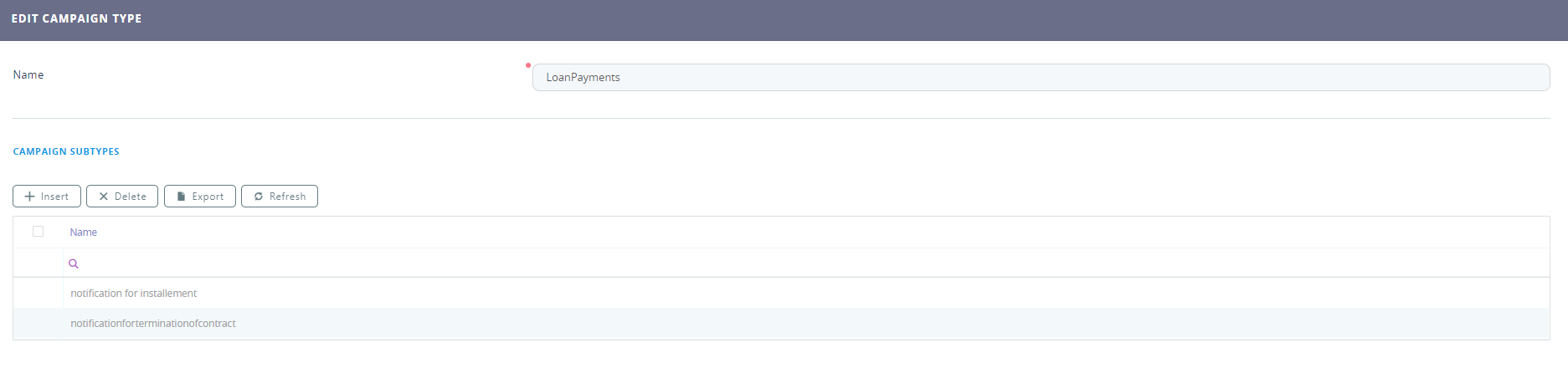 - Click the Insert button at the top right corner of the page. The Add Campaign Type page is displayed.