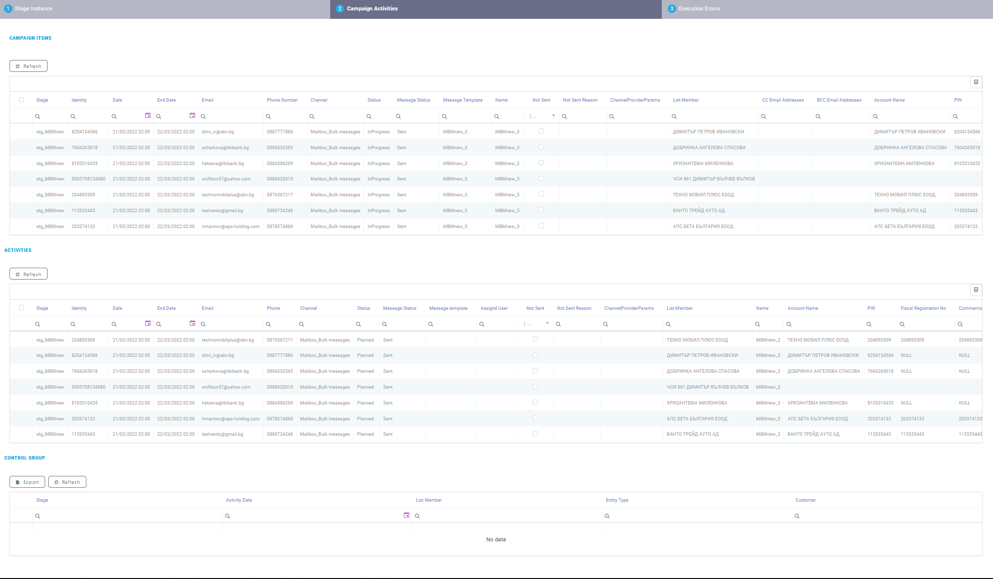 This section contains the internal campaign activities generated within the stage level. For more details see the Internal Campaign Activities page.
